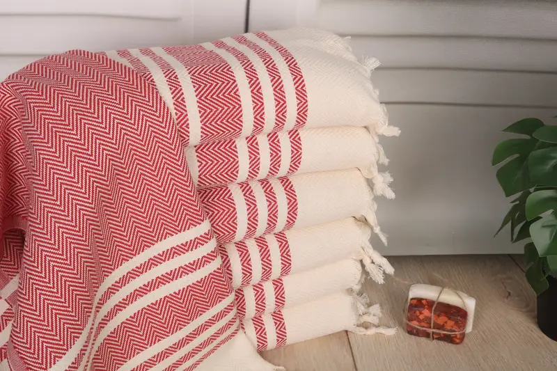 The 20"x36" Red Cotton Tea Towel is characterized by its composition of organic Turkish cotton or natural linen, ensuring a high level of absorbency and durability. Resulting in optimal performance, the towel features a specific weight of 100 grams and dimensions of 36x20 inches or 50x90 cm. Tolerances for hand-weaving may vary within 1-2.5 cm.