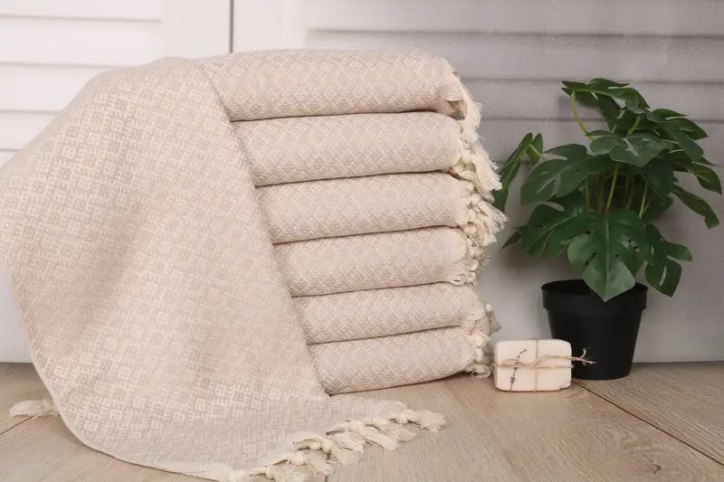 Characterized by organic Turkish cotton, these towels ensure superior absorbency and durability. Measuring 38x20 inches or 50x95 cm and weighing 100 grams, they are carefully crafted with a tolerance of 1-2.5cm for hand-weaving precision. Each towel can be personalized with embroidery, monogramming, or custom designs, allowing for unique and thoughtful gifting.