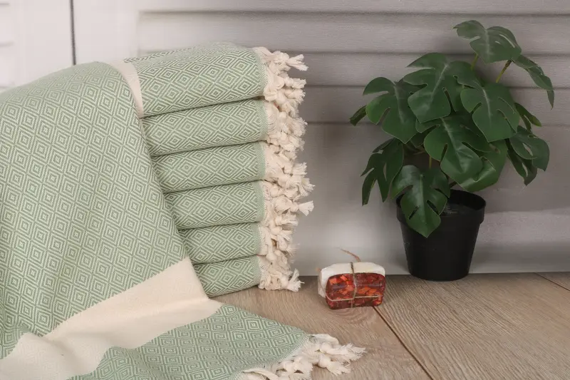 Organic Turkish cotton is utilized for its superior absorbency, ensuring gentle and effective drying. Characterized by the bath towel size of 70x40 inches or 100x180 cm, the product weighs 420 grams. Hand-weaving tolerances are within 1-2.5cm.