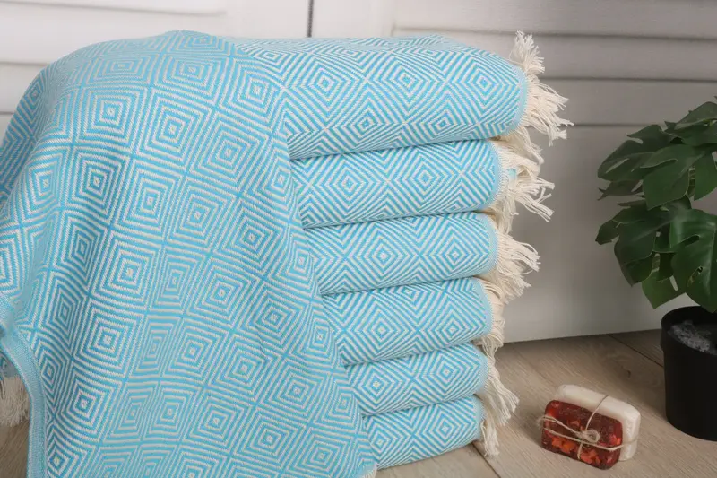 Organic Turkish cotton characterizes this 20"x28" hand towel, ensuring high absorbency and durability. Weighing 90 grams, the towel provides a balanced mix of softness and strength. Measuring 28x20 inches or 50x70 cm, with a tolerance of 1-2.5 cm, it offers precise sizing.