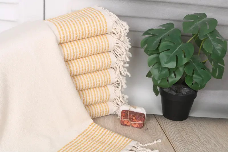 Constructed from organic Turkish cotton or natural linen, the 36"x69" mustard striped towel ensures superior absorbency and a soft texture. Ensuring high-quality craftsmanship, the towel features dimensions of 69x36 inches or 90x175 cm and weighs 460 grams, with tolerances of 1-2.5 cm for hand-woven details. Allowing for embroidery customization, we offer personalization options including letters, initials, or logos. DHL Express, Fedex, and UPS handle shipping with estimated delivery times of 2-5 days. Return costs are borne by the buyer, with ...