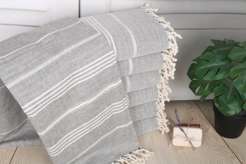Characterized by high absorbency, this black cotton towel is composed of organic Turkish cotton or natural linen, ensuring durability and softness. Measuring 40x71 inches or 100x180 cm, it weighs 300 grams and features hand-weaving with a tolerance of 1-2.5 cm.