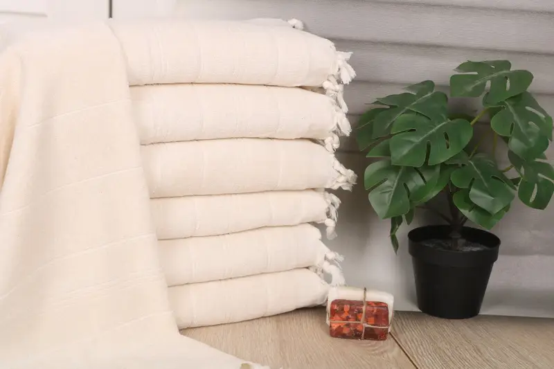 The 18"x40" Natural Cotton Dish Towel is characterized by its high-quality fiber composition. Organic Turkish Cotton, ensuring superior absorbency and softness. These towels are designed with a focus on durability, featuring a meticulously hand-woven construction. The tolerances in hand-weaving allow for variations of 1-2.5cm, ensuring each piece maintains its structural integrity.