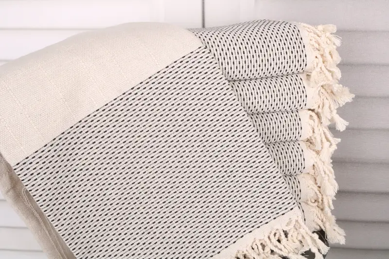 Characterized by organic Turkish cotton and natural linen fiber composition, this towel ensures superior absorbency and softness. Measuring 40x71 inches or 100x180 cm and weighing 480 grams, it is designed with meticulous attention to quality. The towels exhibit a tolerance of 1-2.5 cm due to hand-weaving, resulting in slight variations.