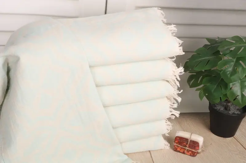 The 24"x40" Mint Cotton Hand Towel is characterized by its high absorbency and durability, resulting from the use of organic Turkish cotton and natural linen. Measuring 40x24 inches or 60x100 cm, it ensures a generous surface area for various kitchen tasks. Weighing 120 grams, it balances lightweight convenience with robust utility, with hand-weaving tolerances of 1-2.5cm.