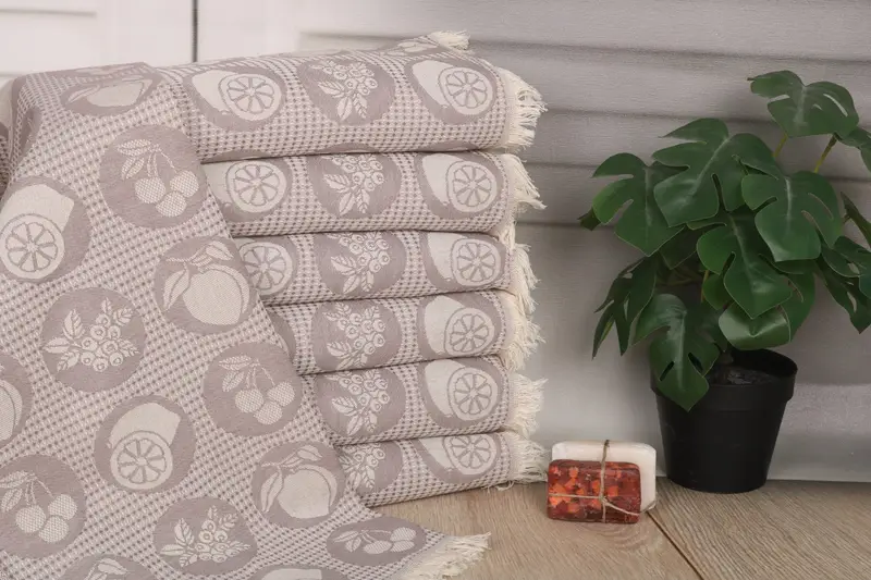 The product is characterized by its material composition, featuring either organic Turkish cotton or natural linen. This selection ensures superior absorbency and softness, resulting in a high-quality textile suitable for various domestic uses. Additionally, the towels are crafted with precision, maintaining a hand-weaving tolerance of 1-2.5cm.