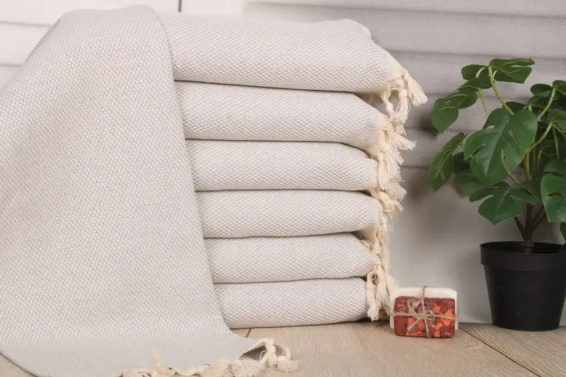 The 18"x40" light gray cotton dish towel is crafted from organic Turkish cotton, ensuring a high level of absorbency and durability. Resulting in a soft texture, the towel weighs 120 grams and features dimensions of 40x18 inches or 45x100 cm, with a hand-weaving tolerance of 1-2.5cm.