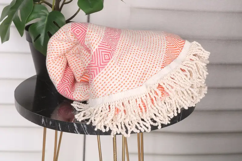 Characterized by precise hand-weaving processes, the towel is offered in a vibrant combination of orange, fuchsia, and beige. Weighing 600 grams and measuring 63x63 inches (160x160 cm) with a 1-2.5 cm tolerance, it provides reliable measurements.