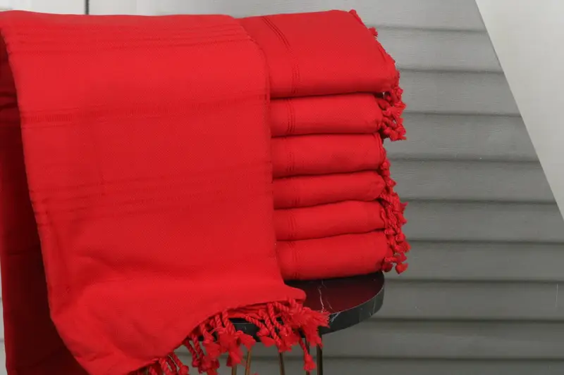 The towels are crafted from organic Turkish cotton or natural linen, ensuring softness and durability. Characterized by a 40x71-inch dimension or 100x180 cm, these towels weigh 280 grams. Their absorbency is complemented by a hand-weaving tolerance of 1-2.5 cm.