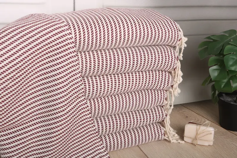 Characterized by premium quality, this 20"x40" Burgundy Cotton Hand Towel is engineered from organic Turkish cotton or natural linen, ensuring superior absorbency and softness. The towel, weighing 122 grams, adheres to a dimensional tolerance of 1-2.5 cm, resulting in consistent quality. Personalization is offered through embroidery or monogramming, with embroidery options requiring specific placement instructions.