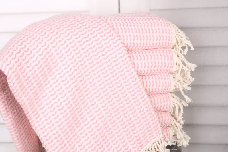 Characterized by superior absorbency, this Turkish beach towel is crafted from organic Turkish cotton, ensuring efficient moisture wicking. Dimensions are 40x71 inches (100x180 cm), with a weight of 430 grams, allowing for comfortable and durable use. Hand-weaving tolerances are within 1-2.5 cm, maintaining consistency and quality.