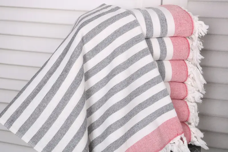The towels are crafted from organic Turkish cotton or natural linen, ensuring durability and superior absorbency. Characterized by their dimensions of 40x67 inches or 100x170 cm and weighing 422 grams, these towels provide ample coverage while remaining lightweight. The hand-weaving process results in tolerances of 1-2.5 cm, ensuring each piece meets high quality standards.