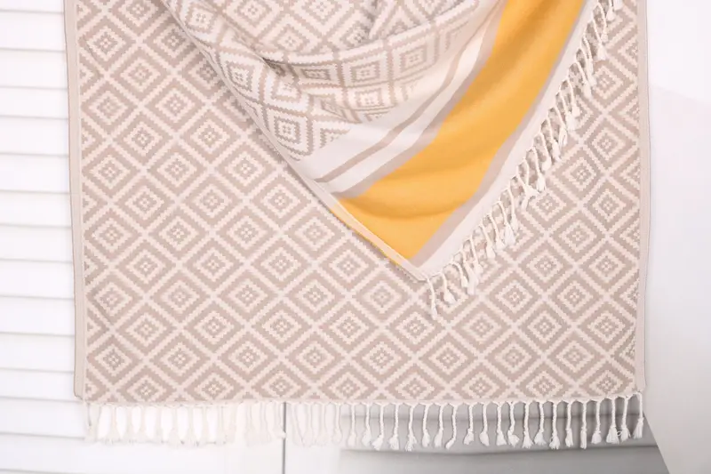 Turkish cotton towels are characterized by their durability and absorbent properties, resulting in a premium product. The towels are composed of organic Turkish cotton or natural linen, ensuring high-quality absorbency. Each towel measures 36x69 inches or 90x175 cm with a weight of 420 grams, maintaining tolerances within 1-2.5 cm.