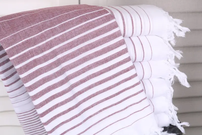 Turkish cotton towels are characterized by superior fiber composition, offering high absorbency and durability. The towels are meticulously crafted from organic Turkish cotton or natural linen, ensuring a luxurious texture and quality. Each piece is 36x67 inches or 90x170 cm in dimension, weighing 160 grams, and characterized by a 1-2.5 cm hand-weaving tolerance.