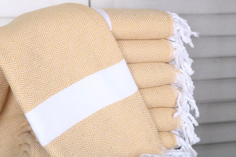 Characterized by superior absorbency, the 40x71 inches mustard cotton towel is made from organic Turkish cotton or natural linen, ensuring a soft and luxurious feel. Weighing 360 grams, its dimensions are 100x180 centimeters. Hand-weaving tolerances allow for minor variations up to 2.5 centimeters in the final product.