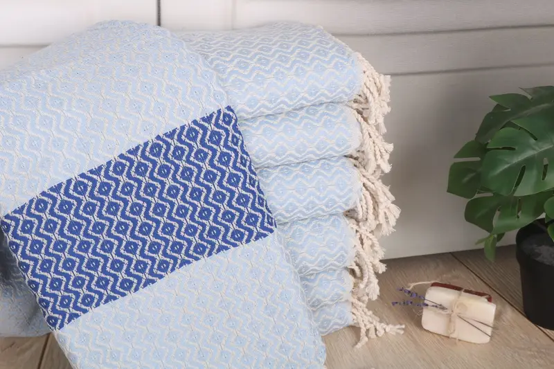 Organic Turkish cotton ensures high absorbency and soft texture. Characterized by precise dimensions of 70x40 inches or 100x180 cm, the towel weighs 440 grams, providing robust hand-weaving tolerances of 1-2.5 cm. Customization through embroidery is available, and pre-shrunk status guarantees uniform size. Shipping via DHL Express, Fedex, or UPS offers 2-5 days delivery. Returns and exchanges are accepted within 7 days, excluding personalized items. Buyers are responsible for customs fees.
