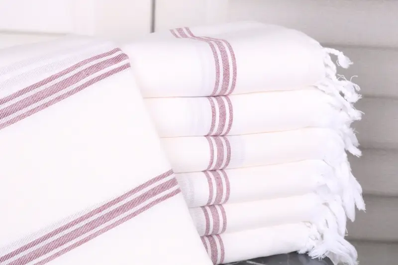 The 40x71 inches (100x180 cm) burgundy cotton towel is crafted from organic Turkish cotton or natural linen, ensuring high absorbency and durability. Weighing 240 grams, the towel presents a premium fiber composition, ideal for multiple uses. Hand-weaving tolerances are up to 1-2.5 cm, adding to its handcrafted quality.