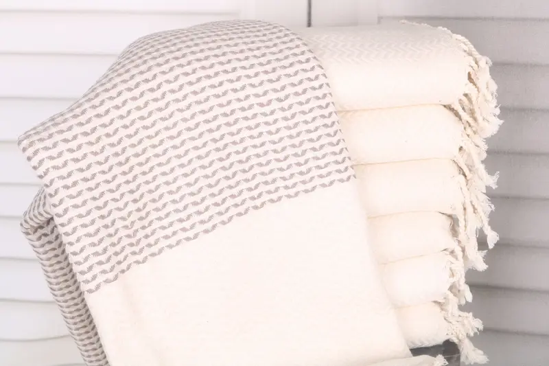 The towels are crafted from organic Turkish cotton or natural linen, ensuring durability and maximum absorbency. Resulting in a high-quality material, these towels maintain a weight of 400 grams. The dimensions of the towels are 40x75 inches, equivalent to 100x190 cm, with a tolerance of 1-2.5 cm due to hand-weaving.
