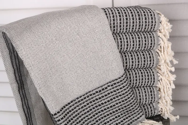 Constructed from organic Turkish cotton or natural linen, the towel ensures superior absorbency and durability. Measuring 36x69 inches or 90x175 cm, it weighs 420 grams, with tolerances in hand-weaving dimensions ranging from 1 to 2.5 cm. Custom embroidery, monogramming, and personalization are available, allowing buyers to specify font, color, and placement.