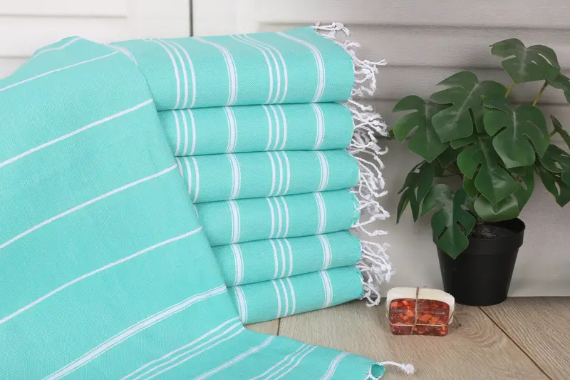 Turkish towels, characterized by their premium fiber composition, are fabricated from organic Turkish cotton or natural linen, ensuring superior absorbency and durability. These towels exhibit a weight of 100 grams, with dimensions of 40x24 inches or 60x100 cm, inclusive of hand-weaving tolerances of 1-2.5 cm. Embroidery customization options are available for personalization, enabling monogramming and letter/initial personalization with recommended placement at the middle bottom.