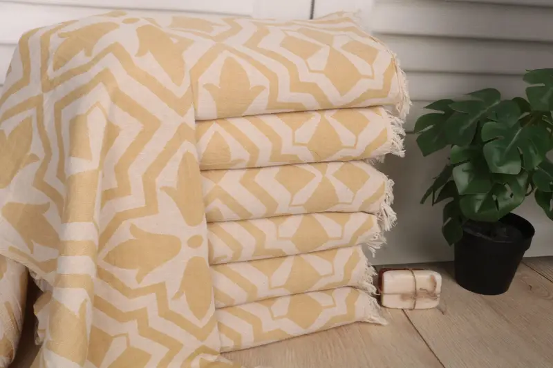 Fabulous fabric, color almost like in the image, very slightly less yellow, a tad more ocre. Unfortunately, zero loop (or tab or anything to hang these) beautiful pieces of towel on. Otherwise perfect and lovely to hang over a chair etc. Came with an extra gift towel.