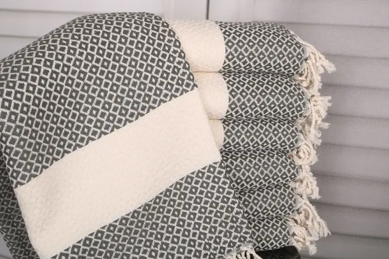 The 40x71 inches or 100x180 cm beach towel is crafted from organic Turkish cotton or natural linen, ensuring durability and absorbency. Weighing 400 grams, it provides a balance between size and weight. The dimensions are precisely 40x71 inches, with a hand-weaving tolerance of 1-2.5 cm.