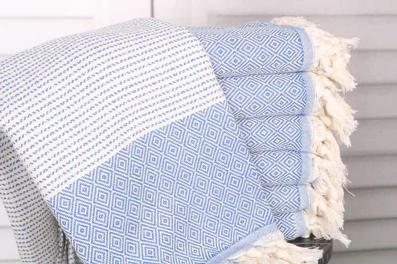 Characterized by superior absorbency and durability, the Diamond Towel is crafted from organic Turkish cotton or natural linen, ensuring exceptional quality. Dimensions are 36x71 inches or 90x180 cm, with a weight of 300 grams. Tolerances for hand-weaving permit variations of 1-2.5 cm.