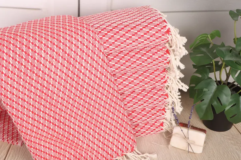 The towels are fabricated from organic Turkish cotton or natural linen, ensuring high absorbency and durability. Characterized by their 40x67 inches (100x170 cm) dimension and 380 grams weight, these towels have a tolerance of 1-2.5 cm in hand-weaving. Resulting in a premium-quality product suitable for diverse applications.