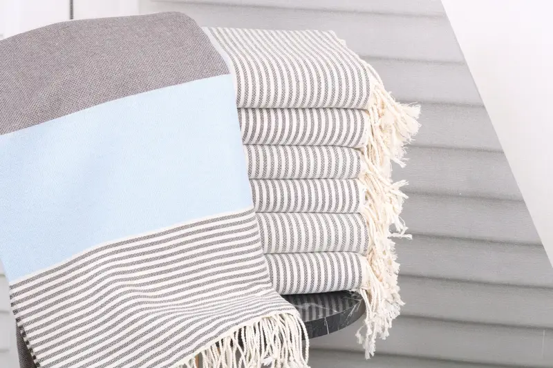 Organic Turkish cotton, renowned for its high absorbency, constitutes the fiber composition of these towels. Ensured by the natural properties of Turkish cotton, these towels exhibit effective moisture absorption, resulting in quick-drying capabilities. Measuring 40x69 inches or 100x174 cm, each towel weighs approximately 298 grams, accommodating hand-weaving tolerances of 1-2.5 cm.