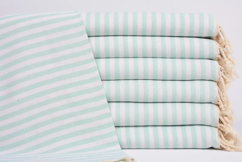 Turkish hand towels, characterized by their 100% organic cotton composition, ensure high absorbency and durability, making them ideal for various applications. Dimensions are specified as 40x18 inches or 100x45 cm, with a tolerance of 1-2.5 cm due to the hand-weaving process. Each towel weighs 100 grams, providing a lightweight yet robust textile suitable for diverse uses.