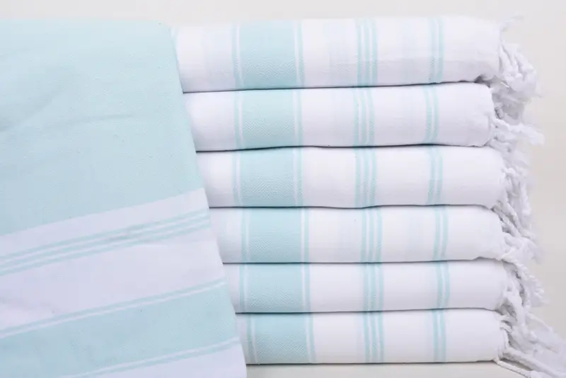 Turkish Bath Towels are crafted from 100% organic cotton, ensuring superior absorbency and eco-friendly attributes. Each towel measures 70x40 inches or 180x100 cm, weighing approximately 310 grams. Handwoven in Turkey, tolerances in size may range between 1-2.5 cm.