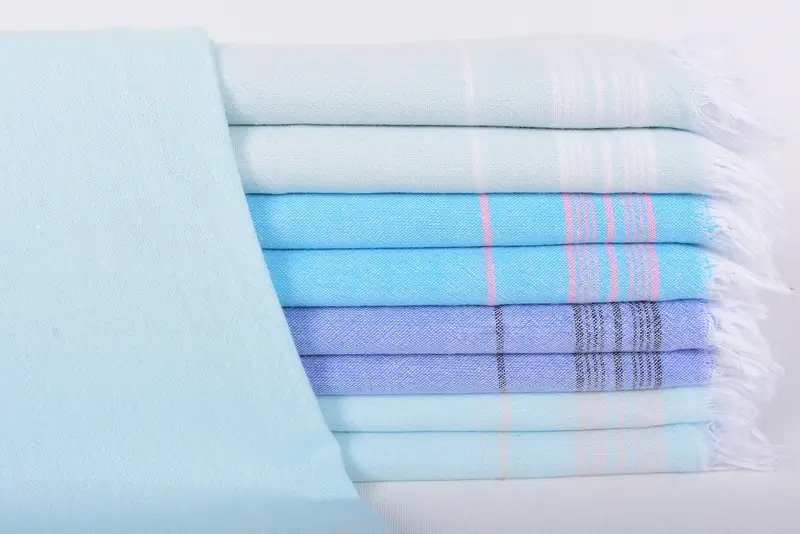 The Turkish towel's material comprises 100 percent organic cotton, ensuring high absorbency and comfort. Characterized by its dimensions of 63x40 inches or 160x100 centimeters, the towel weighs 200 grams or 7.1 ounces. Hand-weaving tolerances may result in minor size variations of up to 2.5 centimeters.