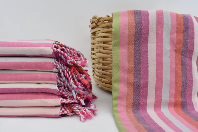 Crafted from 100 percent organic cotton, the bath towel is characterized by its soft texture and superior absorbency. Measuring 70x36 inches or 180x90 centimeters, this light pink striped towel has a weight of 190 grams, resulting in a lightweight yet durable product. Weaving tolerances may slightly affect the size, ranging from 1-2.5 centimeters.