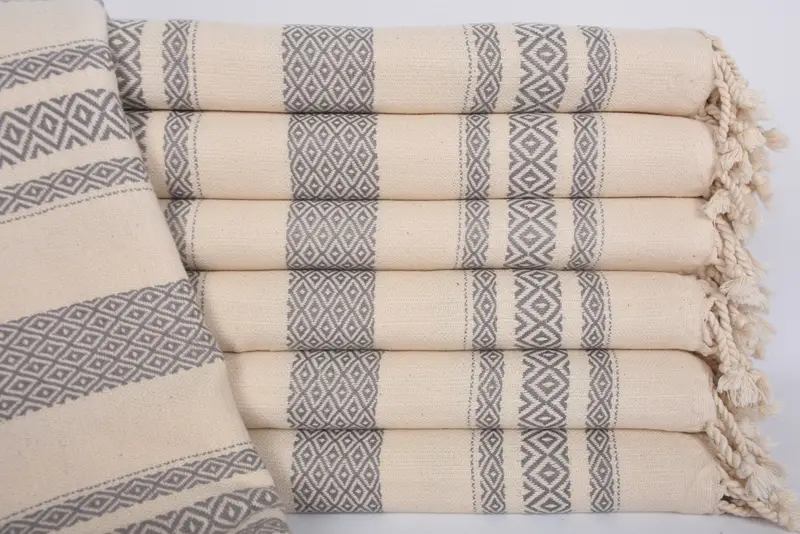 The product, handmade in Turkey, is composed of 100 percent organic cotton, ensuring superior absorbency and comfort. Characterized by a dimension of 70x36 inches or 180x90 centimeters, the Turkish towels exhibit a slight variation in size due to hand-weaving, typically within 1-2.5 centimeters. This handmade nature, coupled with a weight of 400 grams or 14.1 ounces, results in a product that is both durable and lightweight.