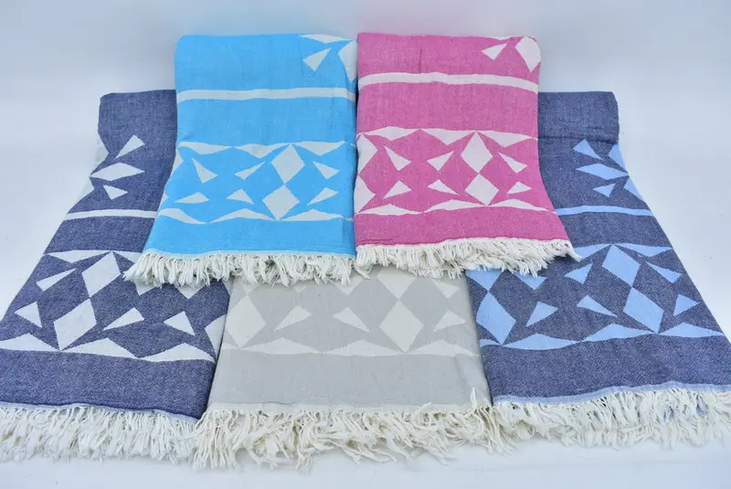 The Turkish towel is characterized by its 100% natural cotton fiber composition, ensuring high absorbency and softness. The dimensions of the towel are 70 inches by 36 inches, equivalent to 180 centimeters by 90 centimeters, with a potential variance of up to 2.5 centimeters due to hand-weaving. The weight ranges between 9 and 12 ounces, or 300 to 400 grams.