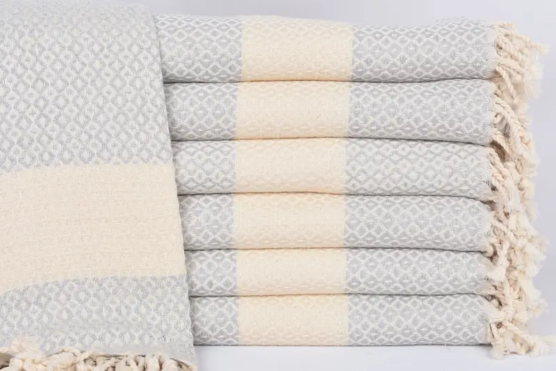 The 70"x40" Light Gray Geometric Towel is characterized by its fiber composition of 100% organic cotton, ensuring superior absorbency and sustainability. Each towel adheres to a size of 70x40 inches or 180x100 centimeters, with a hand-weaving tolerance of up to 1-2.5 centimeters in dimension variations. Customers can personalize their towels through embroidery, resulting in unique monograms or messages, and the towels arrive pre-shrunk. The shipping process employs DHL Express or FedEx, with delivery windows typically spanning 3-5 days globally...