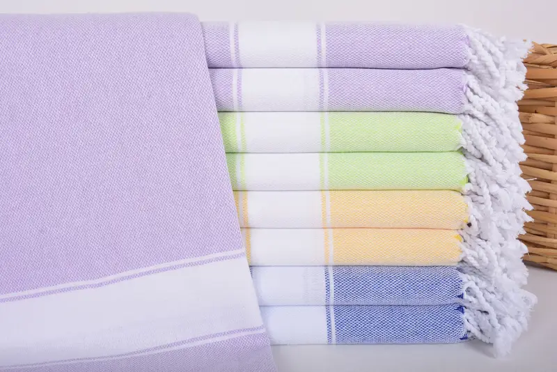 Turkish towels are characterized by their material composition, which includes 100% organic cotton ensuring superior absorbency and softness. These handwoven towels are available in a 70x40 inch size, equating to 180x100 cm, with a tolerance of 1-2.5 cm due to the weaving process. Each towel weighs 400 grams, providing durability and comfort.
