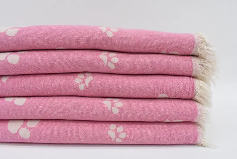 The bath towel is characterized by its 100 percent organic cotton material, ensuring high absorbency and soft touch. Dimensions are specified as 70x36 inches or 180x90 centimeters, with a permissible tolerance of 1-2.5 centimeters due to hand-weaving techniques. This results in a weight of 350 grams or approximately 12.3 ounces per towel.
