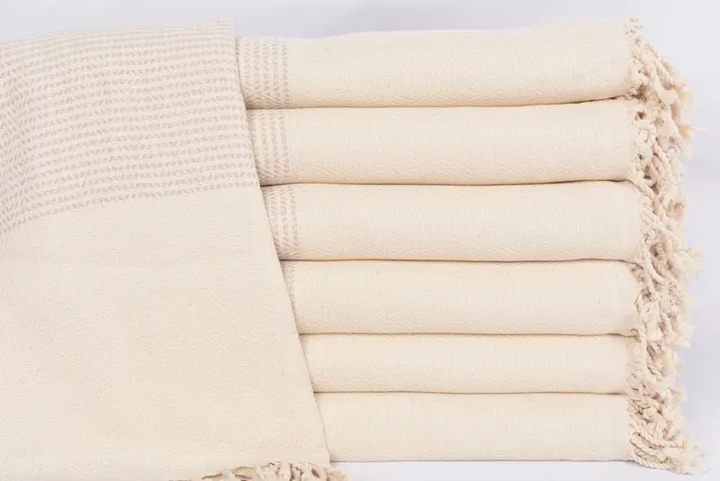 Organic cotton fiber composition ensures superior absorbency and breathability, characterized by its light beige hue and diamond pattern. The beach towel measures 70x40 inches, equating to 180x100 centimeters, with a weight of 450 grams. Weaving tolerances may result in dimensions slightly varying by up to 2.5 centimeters.