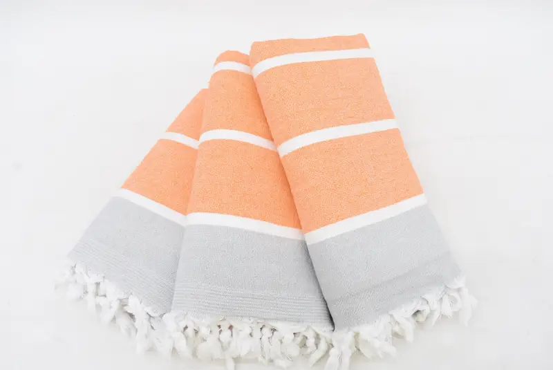 This personalized beach towel is composed of 100 percent organic cotton, ensuring high absorbency and soft texture. Characterized by its sub-category as a beach towel, the primary color is vibrant orange with white stripes. The towels are handwoven in Turkey with precision, resulting in a size of 67x40 inches or 170x100 centimeters, with minor variations of up to 1-2.5 cm due to the weaving process. Weighing 400 grams, the product delivers durability and comfort.