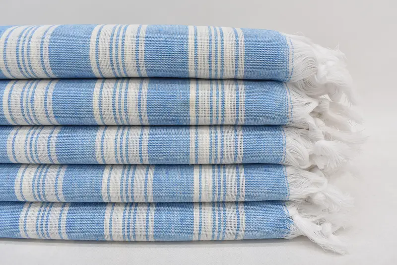 Turkish cotton towels ensure superior absorbency and a soft texture, derived from 100% natural cotton. The dimensions span 66" x 40" inches (170cm x 100cm) with a tolerance of up to 2.5cm, weighing between 7-10 ounces (200-300 grams). Hand-weaving may result in slight variations in size.