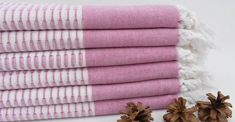 Organic cotton ensures superior absorbency for the bath towels. Characterized by a vibrant fuchsia geometric design, the towels measure 70x40 inches or 180x100 centimeters, with a tolerance of 1-2.5 centimeters due to hand-weaving. Weighing 250 grams or 8.8 ounces, these towels can be personalized with embroidery, allowing for monograms, logos, or special messages, enhancing their value as unique gifts.