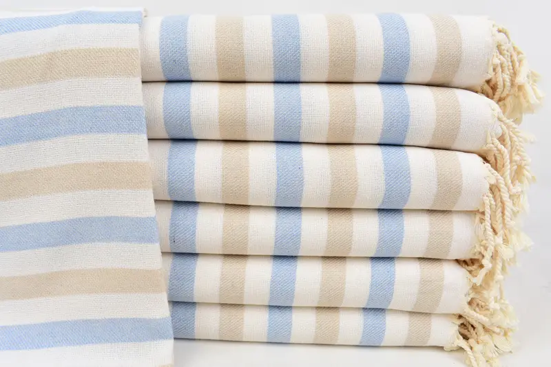 The Turkish Beach Towel is characterized by its material composition, consisting of 100 percent organic cotton, ensuring excellent absorbency and sustainability. It features dimensions of 70x40 inches or 176x100 centimeters with a tolerance of up to 1-2.5 centimeters due to hand-weaving. The towel, weighing 330 grams, offers a balanced weight suitable for various uses.