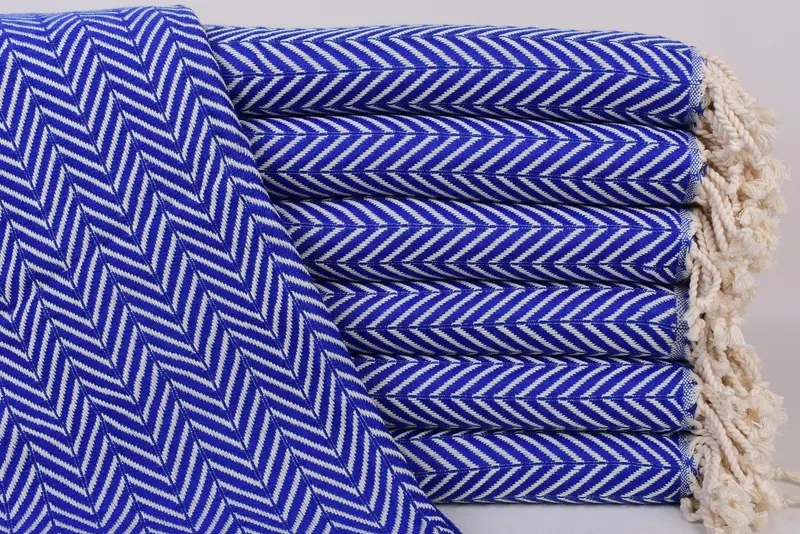 Constructed from 100% organic cotton, the beach towel ensures superior absorbency and comfort. Characterized by a sax blue zig zag pattern with beige secondary color, it measures 70x40 inches (180x100 cm) and weighs 420 grams. The dimensions may vary slightly due to hand-weaving, within a tolerance of 1-2.5 cm.