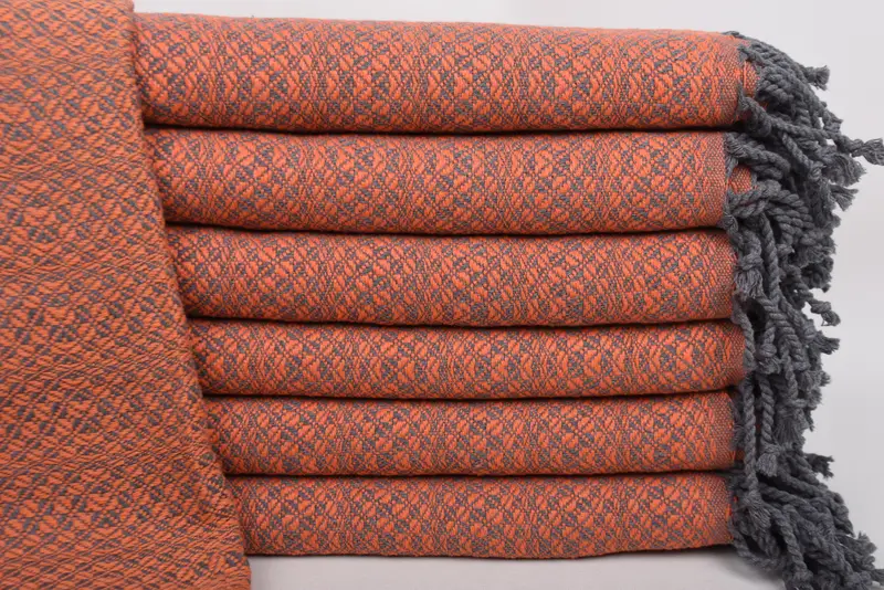 The Turkish bath towel is characterized by its natural linen material, ensuring breathability and absorbency. The towels are handmade in Turkey, using a weaving process that results in dimensions of 70x40 inches or 180x100 centimeters, with a tolerance of 1-2.5 centimeters. The weight of each towel is 450 grams, approximately 15.9 ounces.