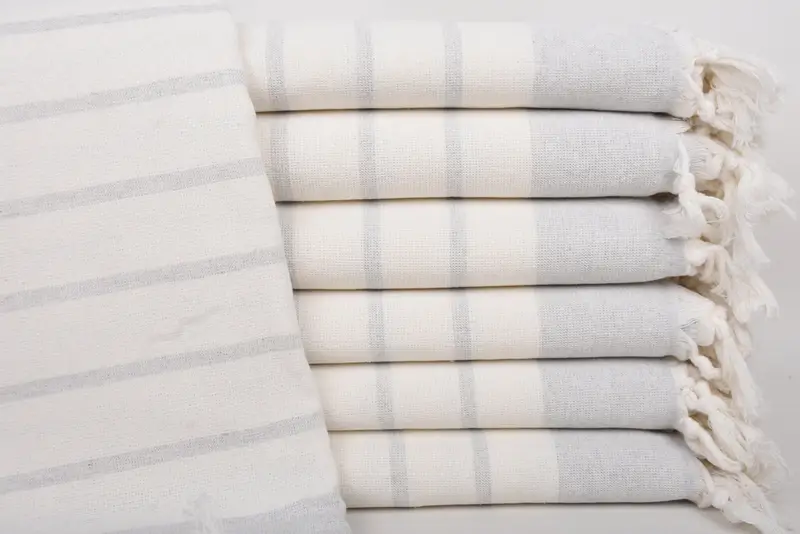 The product is a light gray cotton towel, characterized by its 100 percent organic cotton material. Ensuring optimal absorbency, the fiber composition enhances the towel's utility for various uses, including beach and bath applications. The dimensions of the towel are 39x67 inches, equivalent to 98x170 centimeters, with a weight of 422 grams. Hand-weaving tolerances may result in slight variations of up to 2.5 centimeters.