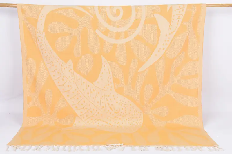 The beach towel is characterized by its material composition, which is 100% organic cotton, ensuring excellent absorbency and sustainability. Measuring 70x40 inches or 180x100 cm, the towel weighs 450 grams or 15.9 ounces, with a hand-weaving tolerance of 1-2.5 cm.
