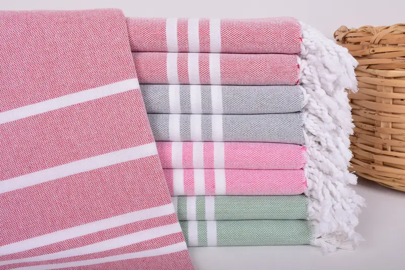 The pink striped towel is made of 100 percent organic cotton, ensuring high absorbency and sustainability. It measures 70x40 inches or 180x100 cm, with a weight of 440 grams, featuring a tolerance of 1-2.5 cm in size due to hand-weaving. Customization is available via embroidery, allowing guests to personalize with monograms, colors, and fonts. Shipping is handled via DHL Express or FedEx, with worldwide delivery within 3-5 days. Note that returns or exchanges for personalized products are not accepted.