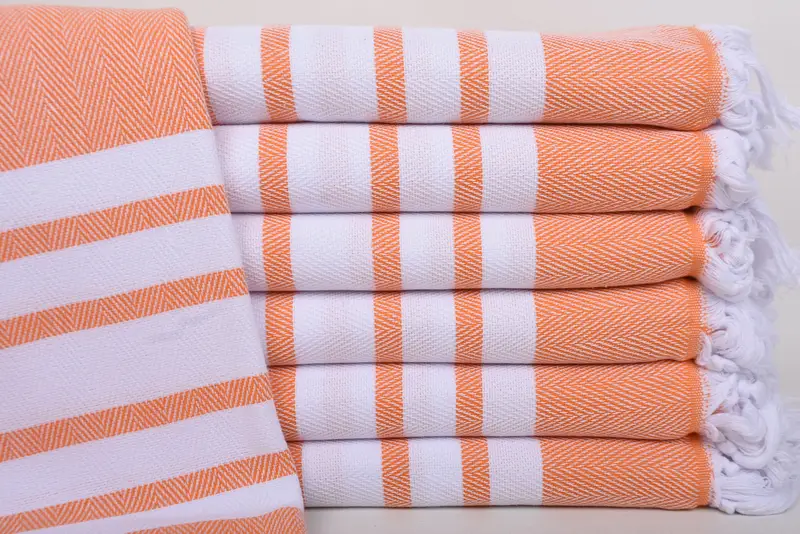 Turkish towels are characterized by their organic cotton composition, ensuring high absorbency and sustainability. Crafted through hand-weaving, the dimensions of these towels are 67x36 inches or 170x90 centimeters with slight variances of 1-2.5 centimeters due to the artisanal process. The weight of the towels is 380 grams or 13.4 ounces.