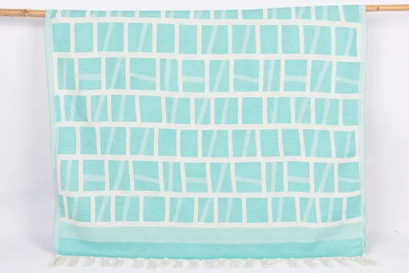 Organic cotton ensures superior absorbency and soft texture for the towel. Characterized by dimensions of 69x34 inches or 175x85 cm, the towel weighs 360 grams. Hand-weaving results in a tolerance of 1-2.5 cm in dimensions.